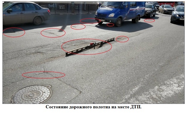 5. Судом установлено, что на момент аварии недостатки в дорожном полотне существенно превышали допустимые, а именно глубина выбоины составляла порядка 0,14 м, ширина 0,5 м, длина 0,9 м, ограждения и предупреждающие знаки отсутствовали вопреки требованию пункта 4.4.1 ГОСТ 50597-93, согласно которому опасные для движения участки автомобильных дорог, улиц и дорог городов и других населенных пунктов, в том числе проходящие по мостам и путепроводам, должны быть оборудованы ограждениями в соответствии с ГОСТ 25804, ГОСТ 23457, СНиП 2.05.02 и СНиП 2.05.03.