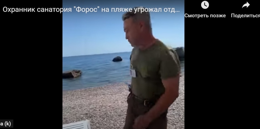 Вот видео, как охранник в камуфляжной форме с нагайкой пытается прогнать туристов с пляжа. Якобы он является лечебным и на этом основании его не могут посещать все желающие. Когда туристы сменили место, деятель выкинул их вещи в море. Также он пытался вырвать мобильник у женщины, которая вела съемку.