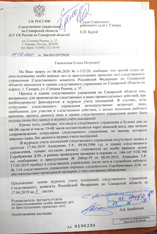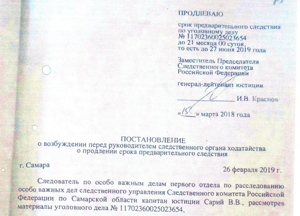 Итак, Сарий сообщил всем, в том числе судьям, что срок следствия продлён, но документ никому не показывал. Впервые подсудимые и защитники увидели это постановление Краснова только в этом 2020 году, в суде в Тольятти. Уголовное дело в прошлом году подсудимым показывали без описи. Фальшивое постановление Краснова и другие документы вложили в дело после того как убедились, что и прокуроры и судьи прикинулись слепоглухонемыми и покрывают преступление следователя Сария.