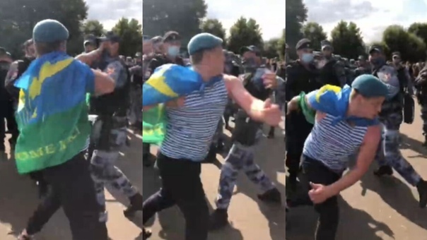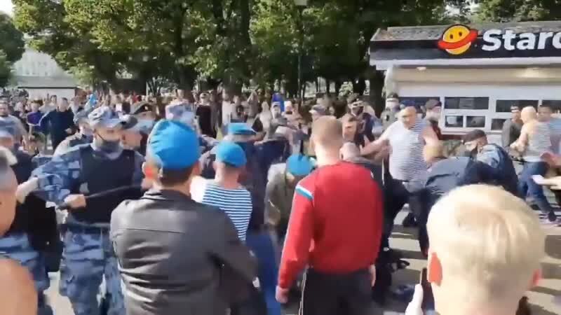 На опубликованных кадрах видно, что агрессивные мужчины в голубых беретах и тельняшках недовольны выставленным в парке сотрудниками Росгвардии оцеплением. Затем происходит стычка одного из десантников с росгвардейцами, за него вступаются другие «голубые береты», и все это перерастает в потасовку.