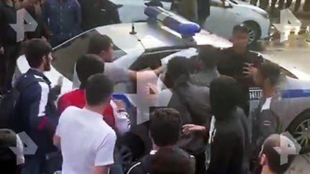 Ранее в распоряжении РЕН ТВ появилась видеозапись, на кадрах которой видно, как десятки людей, выкрикивая нецензурные слова, открывают дверь служебного автомобиля и вытаскивают из салона своего приятеля. Кроме того, некоторые участники потасовки толкают полицейских и пытаются расправиться с другим задержанным, который находится в машине