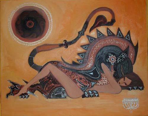 Женщины, по желанию которой мужчины с готовностью превращаются и в медведей, и в прочих монстров, поэтому я выбрала флагманом картину сербской художницы Исидоры Дундьерски "Игры с монстром".