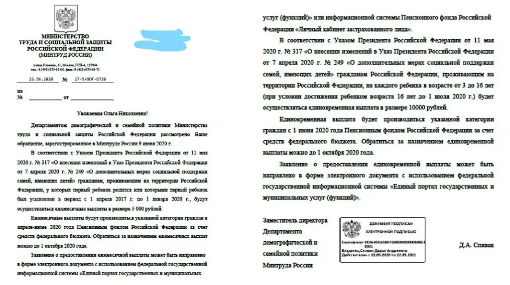 И еще о детях и о проблемах то ли со связью, то ли со здоровьем (уж не знаю)... Я Вам сообщала ранее, что письма написала в правительство, Пескову, Вам. Вопрос задавала в письмах: как же так получилось, что Вы, Владимир Владимирович, на всю страну в марте месяце объявили, что выплаты по 5 тысяч в месяц будут сделаны семьям с детьми до трех лет ВКЛЮЧИТЕЛЬНО, а указ подписали «до трех» и точка. И в письмах этим большими буквами написала я, что ОТВЕТА ПО ПОРЯДКУ НАЗНАЧЕНИЯ И ПОЛУЧЕНИЯ ВЫПЛАТ как до 3 х лет, так и от 3 х до 16-ти мне НЕ ТРЕБУЕТСЯ. Просила ответить ПО СУЩЕСТВУ: куда слово «включительно», сказанное президентом, исчезло? Пришли мне ответы. А в них знаете что? Как раз то, что я просила не писать. А ответа нет.