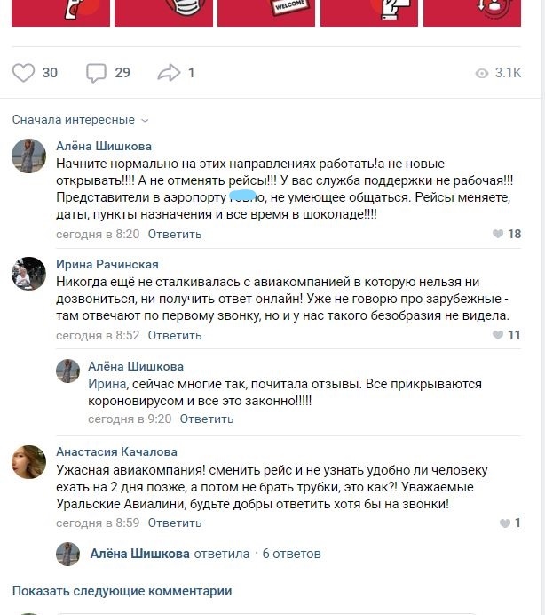 (Скриншот комментариев под последней публикацией в группе "Уральские авиалинии" Вконтакте)