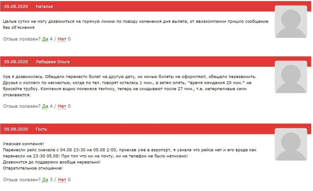 Некоторые пассажиры жалуются на сайтах отзывов. Многие описывают подобные ситуации. Некоторые пишут, что всё же дозвонились, но возврата денежных средств им добиться не удалось.