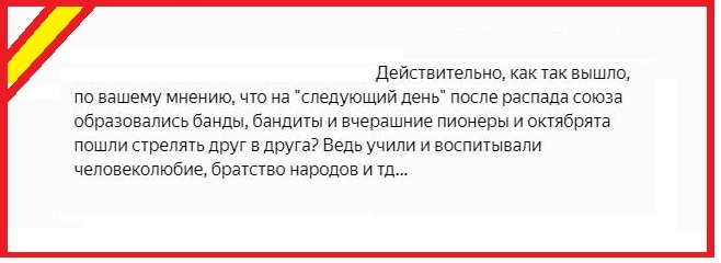 Так что «братки 90-х» появились не на пустом месте. Питательная среда для них была сформирована ещё в 70-х. И именно коммунисты, своей фальшивой приторной и притворной говорильней про добро и человеколюбие, сформировали поколение тех, кто ненавидел само слово «гуманизм». Дело оставалось только за малым – дать этим молодёжным группам идею, что бить морды друг другу надо не просто так, а за бабло. И понеслось.