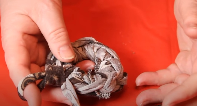 Если используются трикотажная ткань, то перед смоткой в клубок ее лучше немного «растянуть», тогда она ровнее ляжет. Далее делаем клубочек и наш материал для изготовления вещей готов.