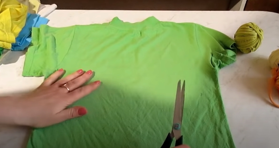 Берем трикотажную футболку и удаляем все ненужное. Убрать надо все швы и подгибы, включая воротник. Эти места получаются толще и жестче, поэтому их лучше выкинуть, тогда вся пряжа будет одинаковой толщины и плотности. Получившиеся кусочки ткани раскладываем на рабочей поверхности и начинаем разрезать на полоски. Ширину линии можно определить самостоятельно, наиболее оптимальной является 1,5 – 2 сантиметра. Можно спокойно отмерить «на глаз», главное чтобы везде размер оказался более или менее одинаковым.