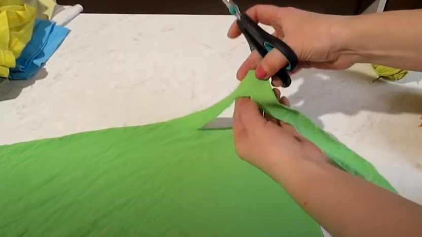 Доходя до края полотна, оставляем расстояние, равное ширине полосы. После начинаем отрезать перпендикулярно. Получившийся уголок обрезаем, чтобы не произошло утолщения нити. Подойдя к следующему углу, делаем то же самое: разворачиваем ножницы на 90 градусов и отрезаем угол. Таким образом, режем ткань «по спирали».