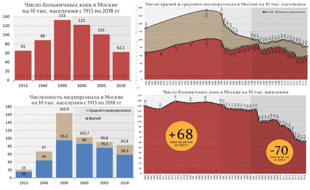 Цифры в статье требуют, на мой взгляд, комментария. В далеком 2014 году Заместитель Мэра г. Москвы по вопросам социального развития Леонид Печатников сообщил об итогах модернизации московского здравоохранения, заключавшейся в постепенном переходе от советской модели здравоохранения, в которой 70% медицинских услуг оказывалось в стационарах и только 30% - в поликлиниках, к обратному соотношению, которое, как представлялось тогда руководителям здравоохранения, отражает мировую практику. Цель модернизации – «сравняться со всем миром», где основное количество медицинских услуг оказывается в амбулаторных условиях, поскольку койка в больнице значительно дороже. После программы модернизации, которая, по мнению Л. Печатникова, явилась, по сути, «шоковой терапией», программа постепенного перевода основных проблем на поликлиническое звено была завершена, переизбыток коечного фонда был ликвидирован, от примерно 120 тысяч коек осталось только 50 тыс. «активных коек», хотя и это мог быть еще не предел. В 2019-2020 годах выяснилось, что данное решение было ошибочным, и быть может поэтому, для людей 65+ был предложен режим «самоизоляции, при том, что часть поликлиник была закрыта и принимала только "ковид" больных.