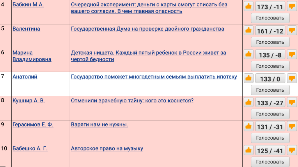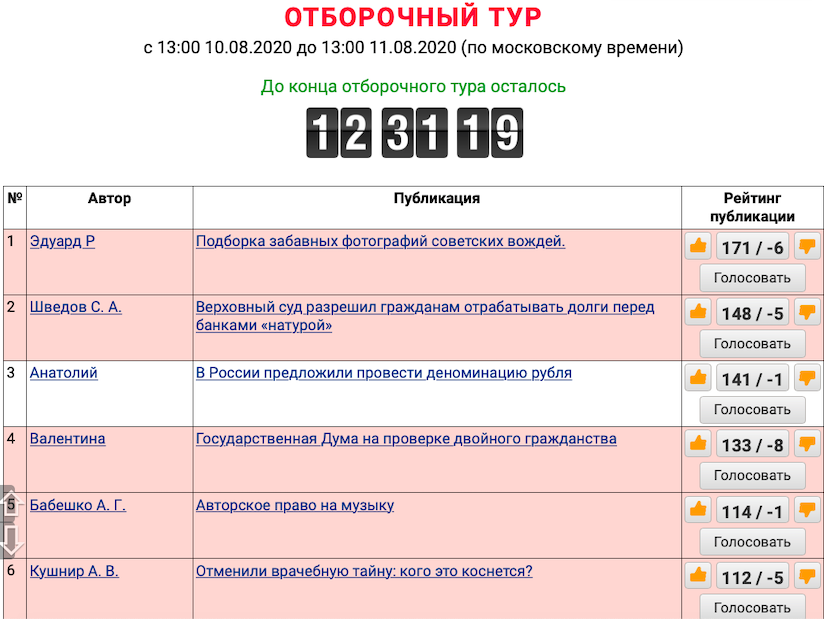 А теперь перейдём к таблице конкурса... Вы спросите почему Анатолий в "белой полосе"? Я Вам отвечу! Потому что отражается у него всего в проголосовавших "на момент скрина" только 8 лайков и один дизлайк. То есть менее 10 лайков в целом, что не даёт ему возможности выйти в полуфинал и "окраситься в розовый цвет" как все полуфиналисты конкурса...