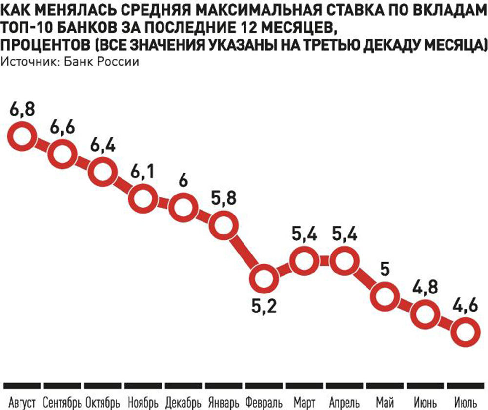 Ставки по вкладам - а сейчас лучшие предложения крупнейших банков достигают только 4,6% - близки к своему нижнему пределу. До конца года они могут упасть еще на несколько десятых процентного пункта. Граждане переложат часть сбережений на фондовый рынок, но масштабного перетока не будет - как показывает опыт, основная масса вкладчиков очень инертна и несет средства даже под заметно сниженную ставку.