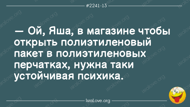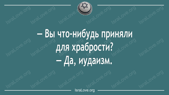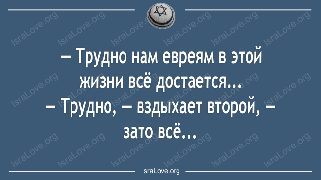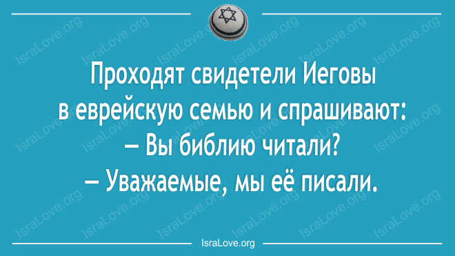 Встречаются два еврея: — Мойша, что я вижу? Ты читаешь антисемитскую литературу? — Таки да! — Но как ты можешь? — Ой, Сема! Почитал я нашу, еврейскую литературу. Сплошной депрессняк нас все гнали, убивали, мучили, резали, устраивали Шоа и Холокост. Аж тошно! А почитал антисемитскую литературу мы, оказывается, правим миром, мы всем заправляем, всех расставляем на важные посты, всех купили.