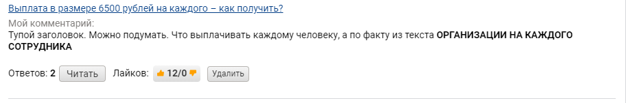 В рамках одной организации это достаточно большие деньги, к примеру, если организация состоит даже из 15 сотрудников, то сумма на каждого будет получаться 97 500. Главное, чтобы организации и индивидуальные предприниматели не злоупотребляли полученными деньгами и не присваивали себе в карман. Ведь остаточно многие так и делают, при этом, получив значительную сумму от государства, увольняют, либо сокращают численность работников.