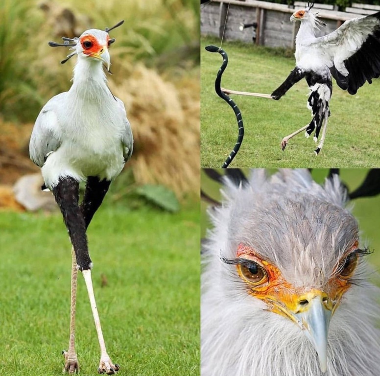 На фото птица - секретарь, названная так благодаря своему ч/б окрасу, напоминающего работника канцелярии.