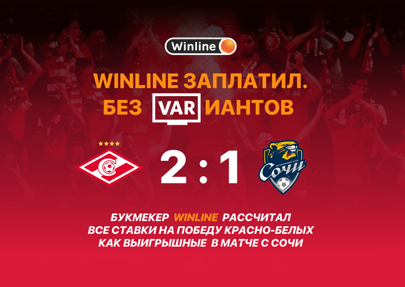 У болельщиков было ощущение, что их ограбили, украв заслуженную победу. В очередной раз в исход встречи вмешался VAR. Ошибочность несправедливо назначенного пенальти уже признал и глава судейского корпуса Виктор Кашшаи. Поэтому букмекер Winline, являющийся многолетним партнером ФК «Спартак», рассчитал все ставки на победу красно-белых как выигрышные. Winline заплатит, без VARиантов, — говорится в официальном заявлении Winline.