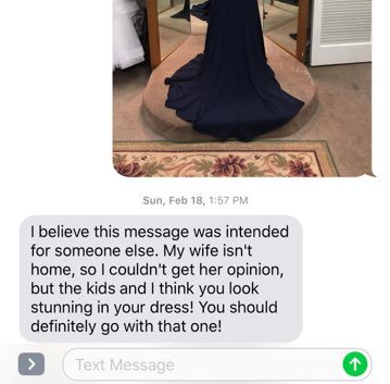 "Я думаю, что это сообщение предназначалось кому-то еще. Моей жены нет дома, я не могу узнать ее мнение, но мои дети думают, что вы выглядите в этом платье ослепительно", — написал он, после чего отправил ей фотографию своих детей, поднявших пальцы вверх.