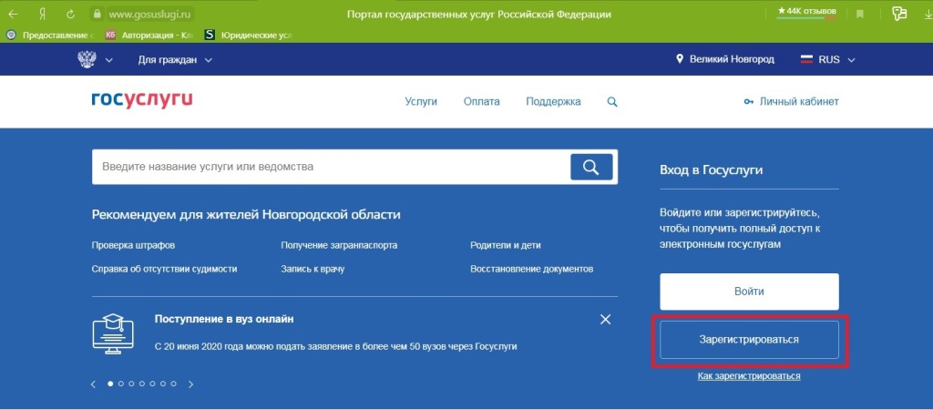 1. Заходите на официальный сайт Gosuslugi.ru и нажимаете «Зарегистрироваться».