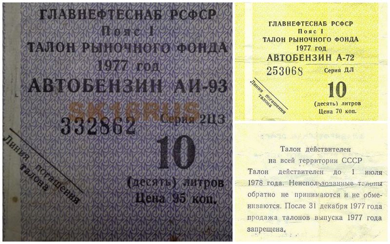 А еще важно знать, что загородные АЗС вместо наличных зачастую требовали талоны. Талоны продавали тоже за городом — в хозмагах и т.п. Не купили заранее — ваши проблемы. Но, собираясь, к примеру, из Москвы в Ленинград, нужно было иметь с собой как деньги, так и талоны. Расстояние между соседними АЗС составляло примерно 40 — 60 км, а прожорливость машин была выше нынешней, поэтому затягивать с заправкой было неосмотрительно.