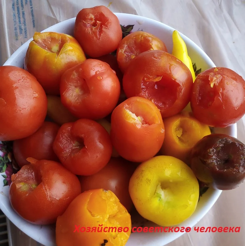 Берем некрупные помидорки всех цветов, какие найдутся в вашем огороде. Я стараюсь брать красные, розовые, оранжевые, черные, желтые - получается очень симпатично!