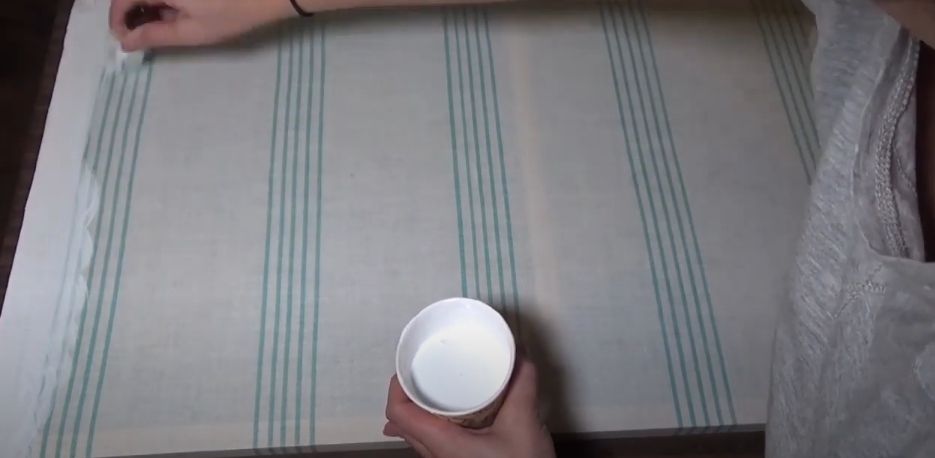 Его роль может играть любая хлопчатобумажная ткань, например, старая простыня. Можно использовать даже цветную, все лишние цвета уйдут в процессе подготовки. Полотно вырезаем по размеру подрамника с припуском в 3 сантиметра с каждой стороны. С помощью степлера закрепляем ее на подрамнике: крепится с одной стороны 1 скобой, потом натягиваем и закрепляем с другой стороны и так поочередно по каждой рейке, по всему периметру. Натягивать нужно так, чтобы ткань не провисала, но и не трещала, иначе порвется. На углах: прикрепляем ткань близко к углу подрамника, загибаем на один из торцов, лишнюю распределяем по изнанке и прибиваем степлером.
