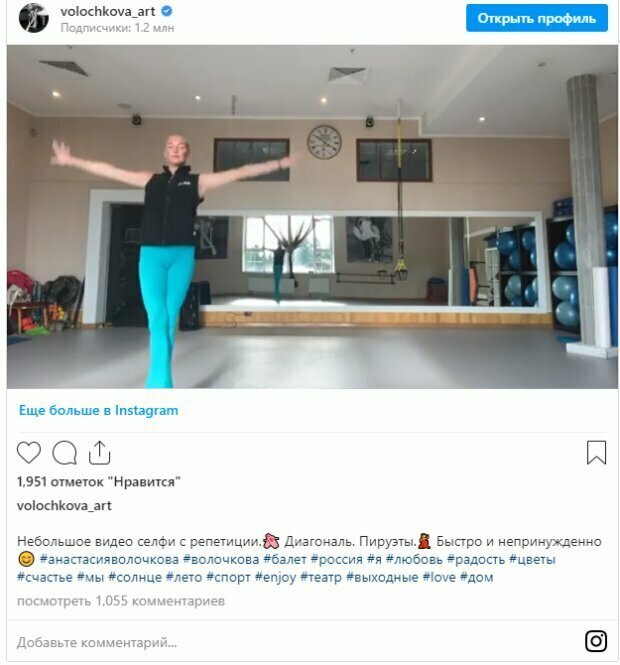 Также ранее в специальном ролике балерина похвасталась несколькими упражнениями и частью занятия, во время которого она в черно-синем спортивном костюме расхаживала со стороны в сторону.