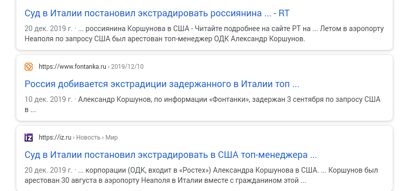 Как видим, Коршунова уже ждала камера в США и самый "справедливый" суд в мире. Но вмешался коронавирус, закрытие стран, и... наша помощь Италии. И как итог, недавнее сообщение "Голоса Америки" - "Власти Италии экстрадировали в Россию топ-менеджера входящей в Ростех Объединенной двигателестроительной корпорации Александра Коршунова"! Правда неожиданно? Италия помнит кто ей помог и благодарна за это.