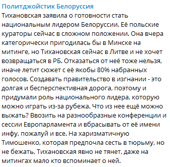 А политтехнолог Марат Баширов считает, что Тихановская поставила в крайне неудобное положение польских кураторов протестов в Белоруссии. Возвращаться на родину она не собирается, а формировать правительство в изгнании - дело бесперспективное. Остаётся только возить Тихановскую по конференциям и сессиям Европарламента, чтобы она выступала от лица Белоруссии.