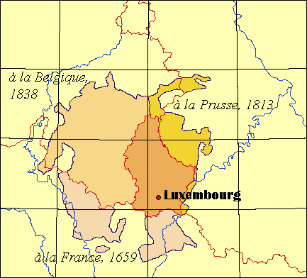 Карта разделов Люксембурга. Изначально герцогство было в 4 раза больше нынешнего