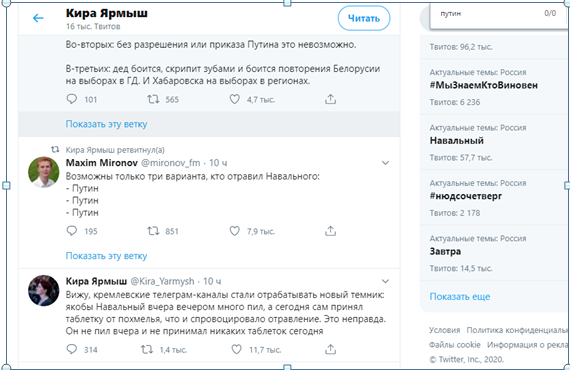 Удивительное объяснение от Любовь Соболь. Суть которого заключается в том, что Навального "пасут" спецслужбы. По ее мнению из этого следует, что без отмашки свыше столь сложное мероприятие как отравление человека провести были бы просто невозможно! Серьезно? Спецслужбы это личная и безусловная охрана Навального? И не могло быть утечки информации о его передвижениях другим заинтересованным лицам?