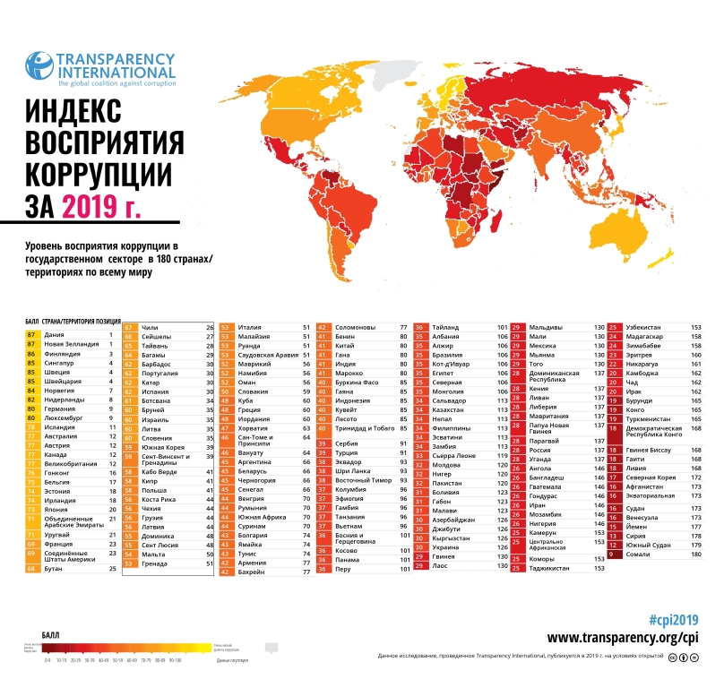 По итогам 2019 года Россия набрала 28 баллов, заняв 137 место (из 180) Подробнее ➤
