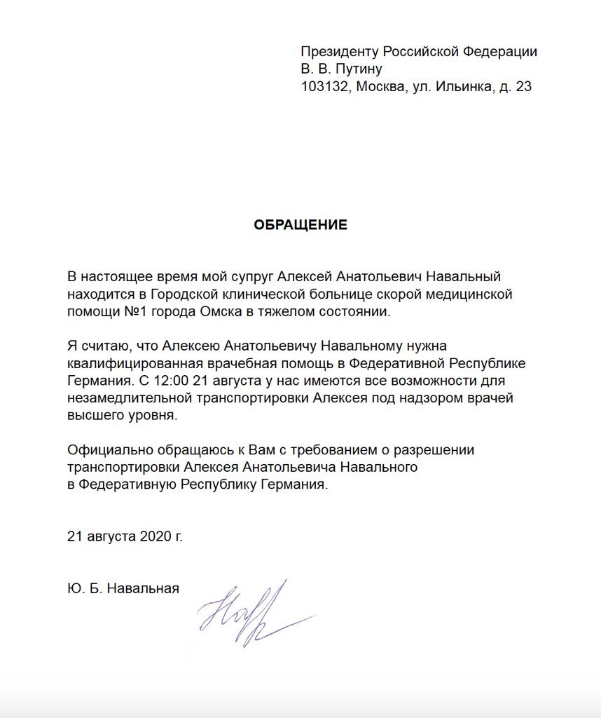 Навальная написала, что ее супруг находится в Городской клинической больнице скорой медицинской помощи №1 города Омска в тяжелом состоянии. Она считает, что Навальному необходима квалифицированная помощь в Германии. При этом все возможности для транспортировки блогер имеются.