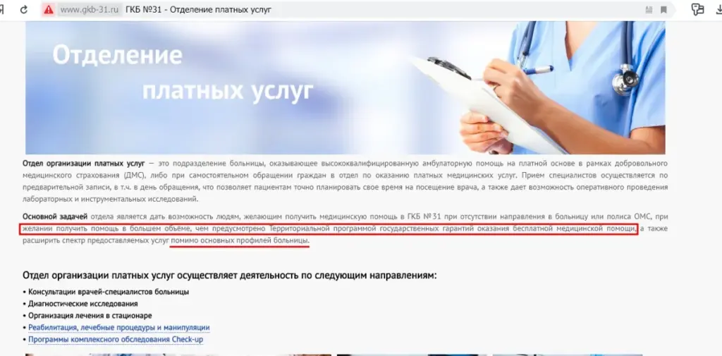 Все описанные выше примеры свидетельствуют о комплексном разве медицины, ее коммерциализации начиная от платных или вовсе отсутствующих парковок до ориентации на платные услуги.