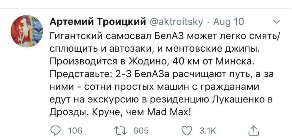 Он не врет! Хватали людей по дворам, били машины и далеко не тех, кто участвовал в протестах! Вам просто лень почитать показания людей и узнать заключения врачей! Хотя вам думается, как вам удобно. А у меня возле дома хватали людей, которые просто поставили машину и шли к подъезду. Хотите попасть под такое? Потом жена искала три дня мужа! Нашла избитого. Вот честно, идите лесом, я так жалею, что наткнулась на этот сайт. Когда читаю всех вас только одно желание возникает - поменять паспорт, что я и сделаю, даже если не уберут таракана. Он за 26 лет угробил всю страну! Нет ни одного предприятия незакредитованного настолько, что легче стать банкротом, чем вылезти из долгов. Все колхозы живут за счет предприятий, которым приходиться под это брать кредиты. За каждым предприятием закреплен какой-нить колхоз)) то что вы кушаете, уже давно не белорусское))) савушкин, кстати, испортился и качество говно стало. Остальные принадлежат иностранному капиталу)) не буду все расказывать, за 15 лет насмотрелась всякого. Закона тут нет, он просто не действует. Сама присутствовала на судах. Так что, все, все лесом.
