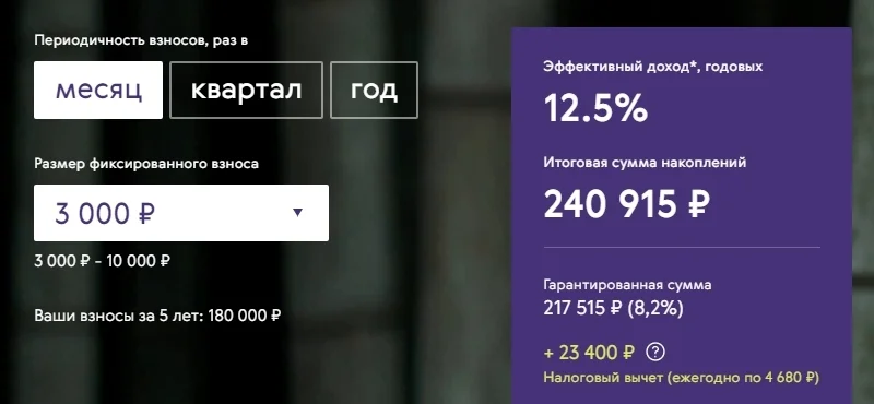Порог входа в программу – откладывать всего 3 тысячи рублей в месяц. Через 5 лет у вас на счете будет 240915 рублей.