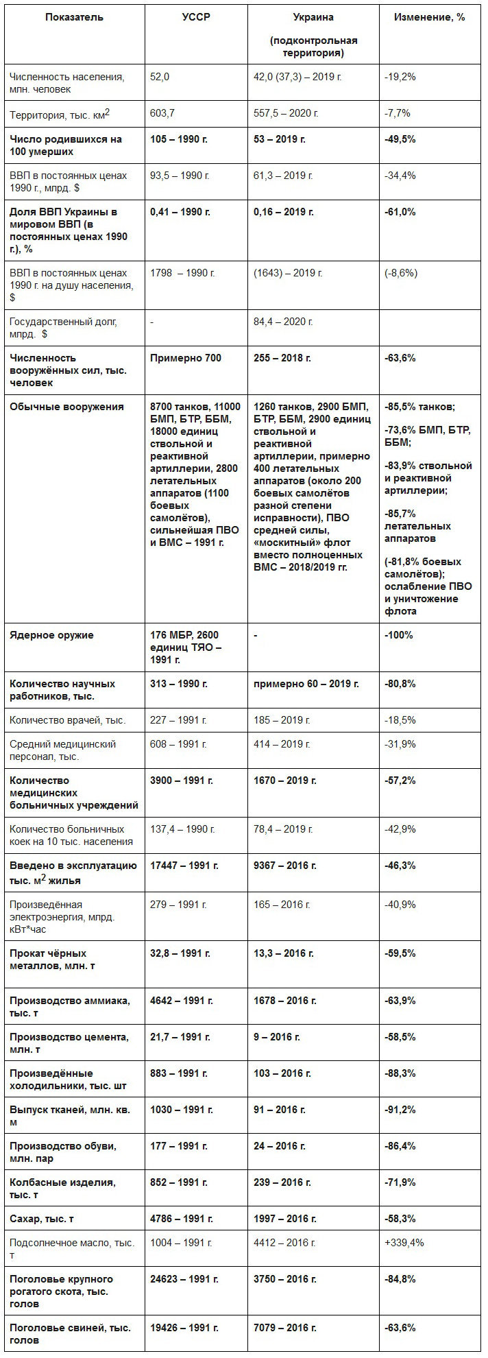 В связи с празднованием очередного Дня Независимости Украины он собрал данные по численности населения, рождаемости, экономике и военному потенциалу, доставшегося республике от УССР. И сравнил их с показателями времен независимой Украины. Результат явно не в пользу последней.