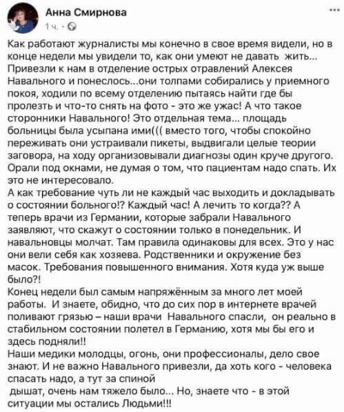 "Брат оппозиционного политика Алексея Навального Олег обвинил в «наглой лжи всему миру» главврача омской больницы Александра Мураховского. На своей странице в Facebook Олег Навальный пишет, что Мураховский «за час до того, как ему поступила команда отпустить» (Навального за границу — прим. Ред.) говорил, что пациент нетранспортабелен. Хотя весь медперсонал, отмечает Навальный, говорил, что пациента «надо увозить».