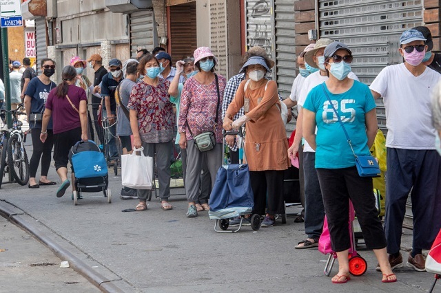 Причиной такой ситуации стал рост безработицы, связанный с коронавирусом. Продукты нуждающимся выдаёт продовольственный банк Ла-Хорнада. До начала пандемии в неделю такая помощь требовалась примерно 1 тыс. семей. Однако теперь их число выросло до 10 тыс. Также продовольственный банк организует ежедневные горячие обеды, на которых с помощью добровольцев удаётся накормить около 1 тыс. человек, в том числе и детей. Сотрудники продуктового банка считают, что в пяти районах Нью-Йорка голодает несколько сотен тысяч людей.