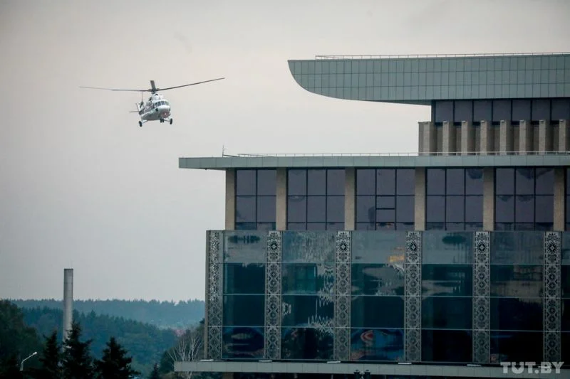 Пресс-служба Лукашенко опубликовала кадры прибытия в резиденцию на вертолете. Лукашенко из него вышел в бронежилете и с автоматом в руках. Вместе с президентом прилетел его 15-летний сын Николай. Он тоже был вооружен.