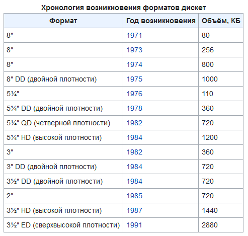 Согласно таблицы мы видим что емкость дискет варьируется в пределах 80 - 2880 Кб. 1 Кбайт=1024 байт, 1 байт=8 бит. 1 бит - простейшая единица информации: "0" или "1".