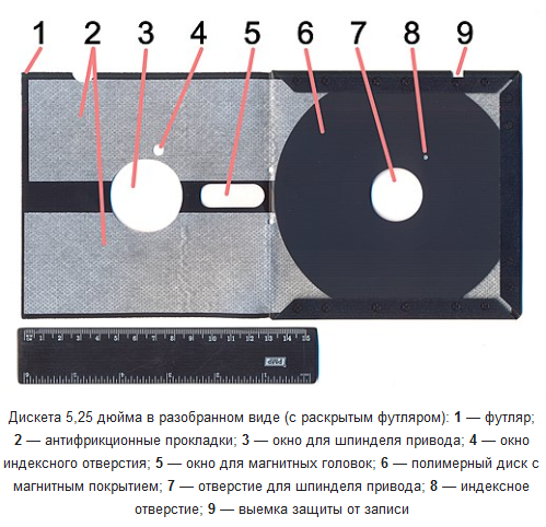 Информация о содержимом дискеты указывается на этикетке, обычно располагающейся на лицевой стороне в части, противоположной отверстию для магнитной головки дисковода.