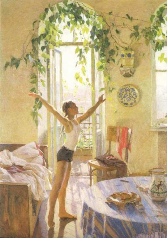 Эта картинка была в школьном учебнике, может, и сейчас есть. По ней писали сочинения. Мне она нравилась: светлая, радостная, чистая. Чуть итальянская – с этим солнцем, арками, листьями. И сексуальная, ясное дело. Татьяна Яблонская, «Утро», 1954 год. Совсем недавно откинулся Сталин, так что картина передала настрой эпохи. Ночь ушла, девчонка-подросток вскочила, делает зарядку, она счастлива, у нее впереди долгий прекрасный день. С улицы доносится бодрый шум.