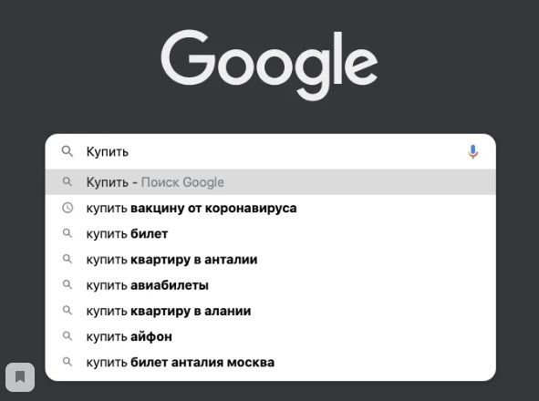 Но многих и уговаривать не нужно. Они сами набирают в Гугле запросы, и если набрать в поисковой строке слово «купить», то на первом месте появляется фраза «купить вакцину от коронавируса».
