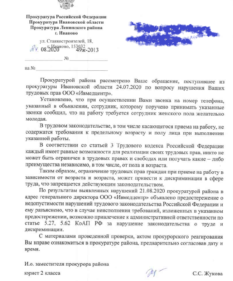 Извините, но на подробный рассказ времени нет. А если кратко, мой уже не молодой клиент и одновременно знакомый, прочитав объявление попытался на работу устроиться на должность администратора, но ему отказали пояснив, что желают видеть молодую девушку на этой должности. По моему совету он записал телефонный разговор, что оказалось очень кстати и впоследствии запись разговора была направлена как приложение к составленному мной обращению, в адрес прокуратуры.