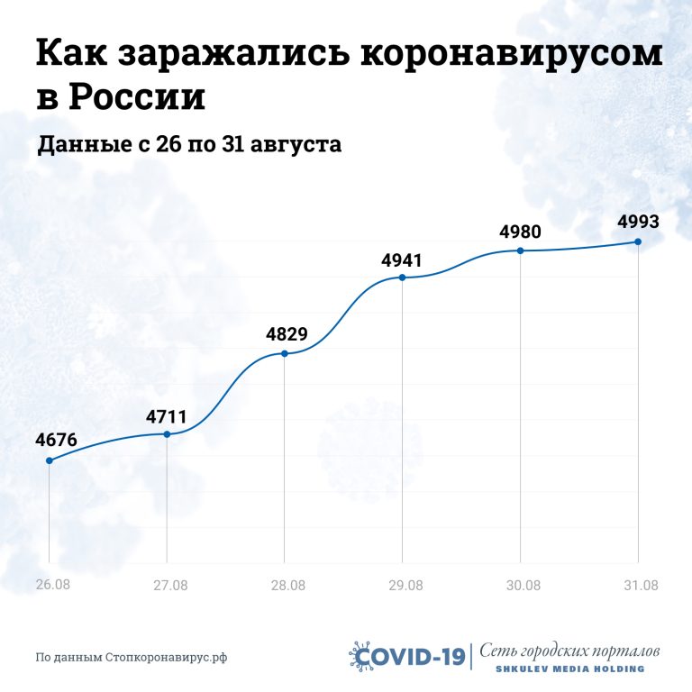 В России уже несколько дней подряд растет количество выявленных за сутки случаев коронавируса. Если 26 августа оперативный штаб по борьбе с распространением инфекции отчитался о 4676 вновь зараженных, то уже на следующий день выявили 4711, а 31 августа сообщили о 4993 новых случаях — самая большая цифра за две недели. Неужели вторая волна заболеваемости уже началась?