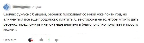 Я говорю конкретно за себя)) за других я не могу отвечать! Плачу алименты исправно, сам них настоял... зарплата полностью белая! Я каждые пол года забираю ребенка к себе на месяц... все финансовое обеспечение полностью на мне. Дорога + все остальное... свозил ребенка на море, дельфинарий, сафарипарк... Ведь у нас в стране равные права и обязанность у родителей на ребенка... Я ни разу не сказал, а давай пока ребенок у меня, переведи мне алименты обратно, или давай дорогу на пополам оплатим, и содержание ребенка... А почему мне периодические не дают общаться с ребенком?!