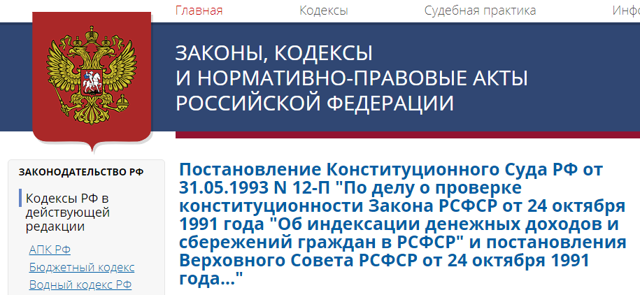 Постановлением Конституционного Суда РФ от 31.05.1993 N 12-П "По делу о проверке конституционности Закона РСФСР от 24 октября 1991 года "Об индексации денежных доходов и сбережений граждан в РСФСР" и постановления Верховного Совета РСФСР от 24 октября 1991 года..." было признано, что несоблюдение порядка введения в действие и неприменение всех требований этого закона нарушили основные права граждан, закрепленные в статьях 13 и 52 Конституции Российской Федерации.