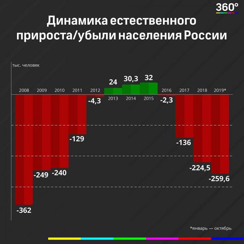 Однако в первом полугодии 2020 года естественная убыль россиян уже составила 265 500 человек. Население России сокращается на протяжении продолжительного периода времени, только в 2013–2015 годах мы наблюдали небольшой прирост, а в остальные периоды картина выглядит совсем печально.
