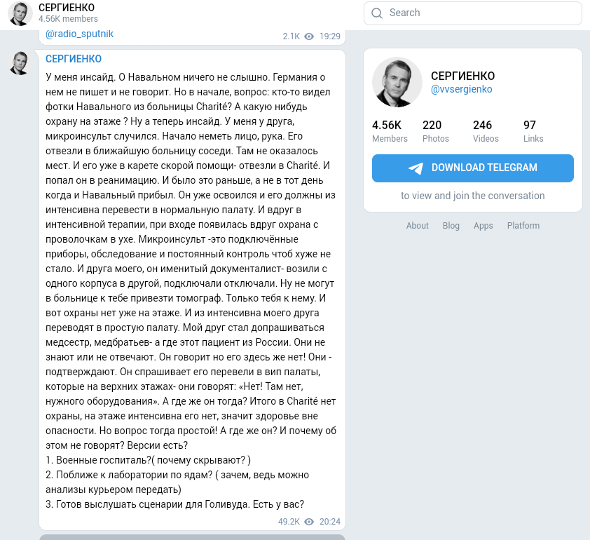 Владимир Сергиенко, политолог с украинскими корнями живущий в Германии, написал в своем телеграм-канале, что у него есть сведения о том, что российского оппозиционера Алексея Навального может не быть в клинике Charite.