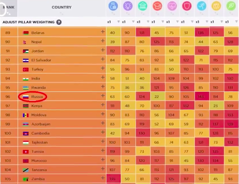 По уровню качества экономики Россия в 2018 году занимала 63-е место, по развитию деловой среды — 60-е. Очень плохо дела обстояли с госуправлением — 124-е место. Еще хуже было в России в 2018 году с личными свободами — 143-е место, ниже, чем у Ирана, Свазиленда и Чада. Хуже, чем в России, ситуация с персональной свободой только в Мавритании, Алжире, Йемене, Судане, Афганистане и Египте. По безопасности Россия занимала 105-е место... Как писал журнал Forbes, несмотря на скромное 96-е место (в 2018 году), по сравнению с прошлыми годами позиции России улучшились, так как в 2017 году страна занимала 99-е место, а десять лет назад, в 2007 году — 108-е место.